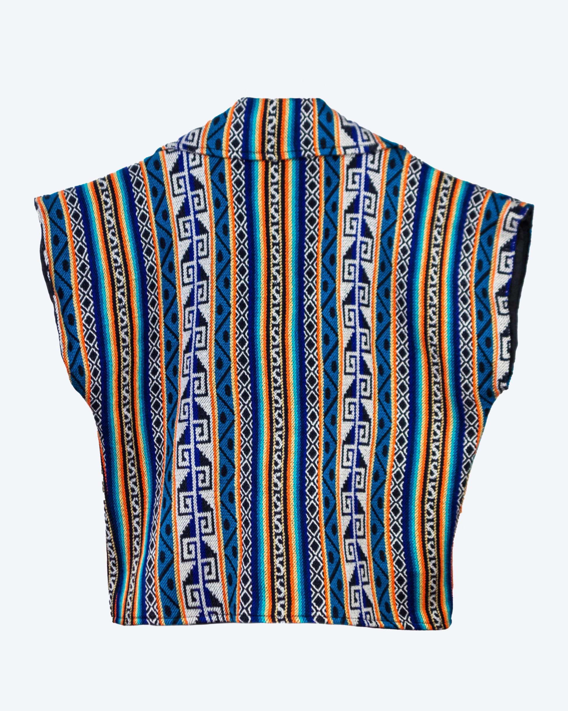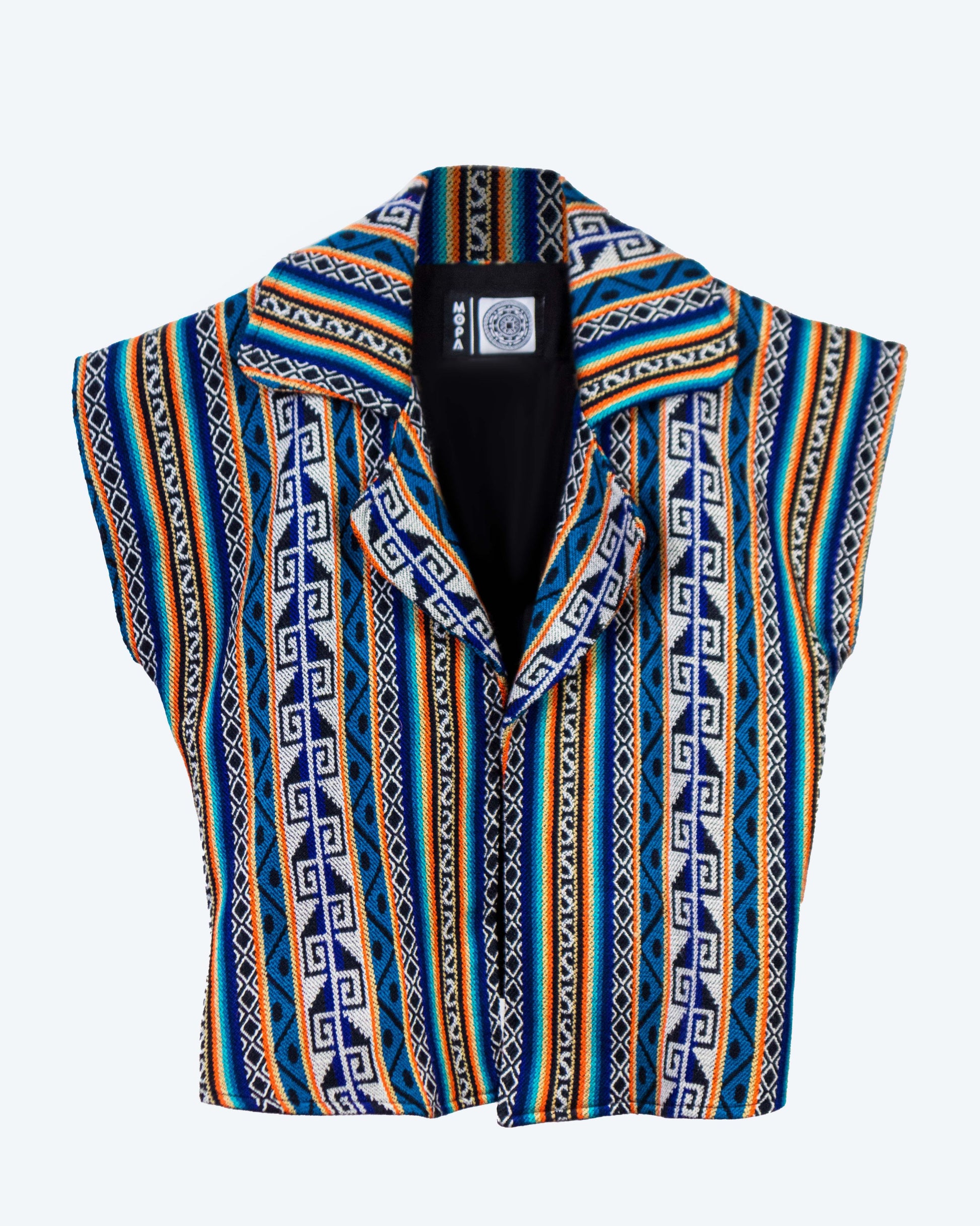 Este top de tejido andino combina la estructura del denim con la calidez de los tejidos artesanales, creando una pieza única, femenina y poderosa.