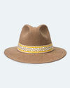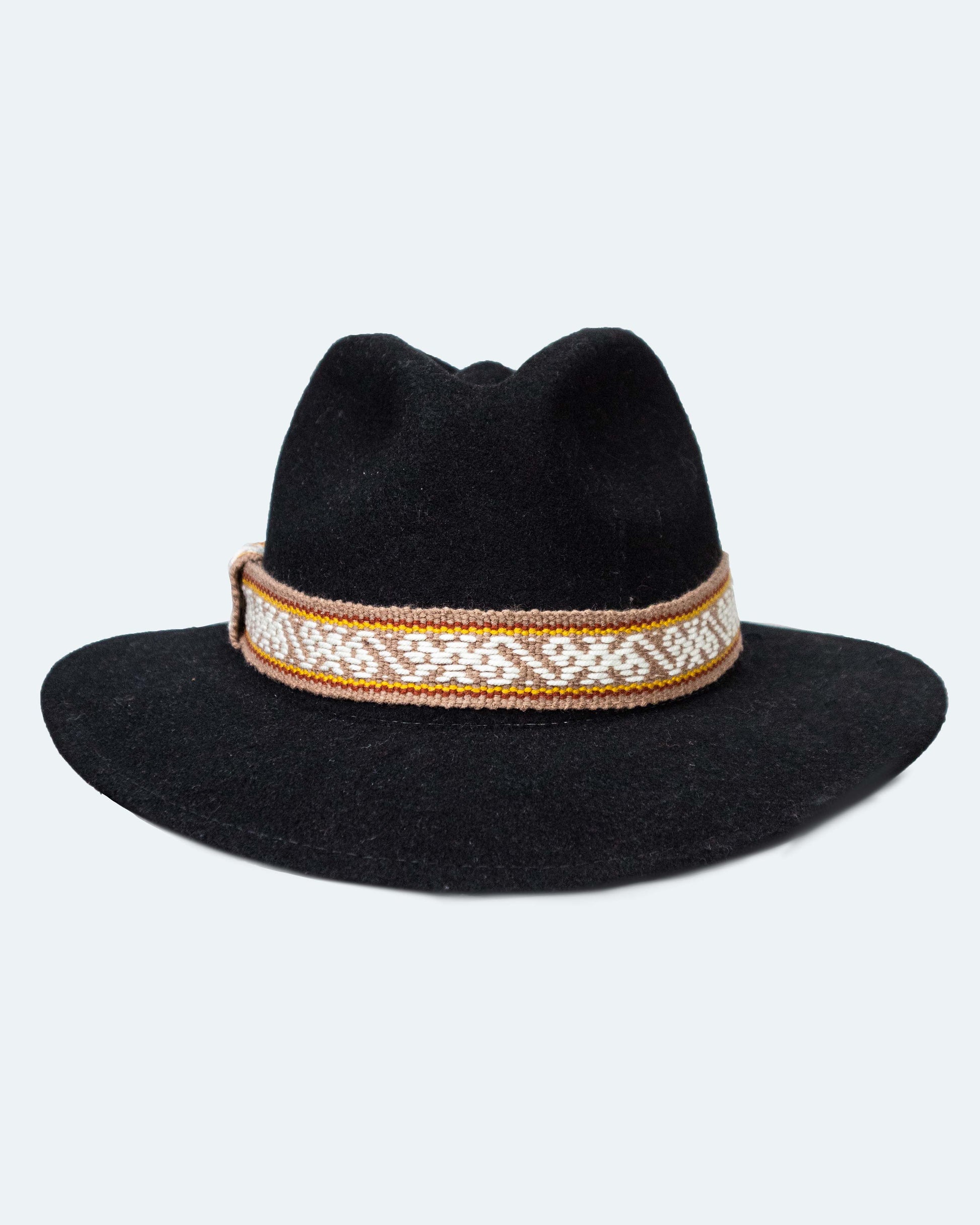 Este sombrero de tejido andino combina la estructura del denim con la calidez de los tejidos artesanales, creando una pieza única, femenina y poderosa.