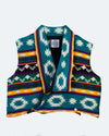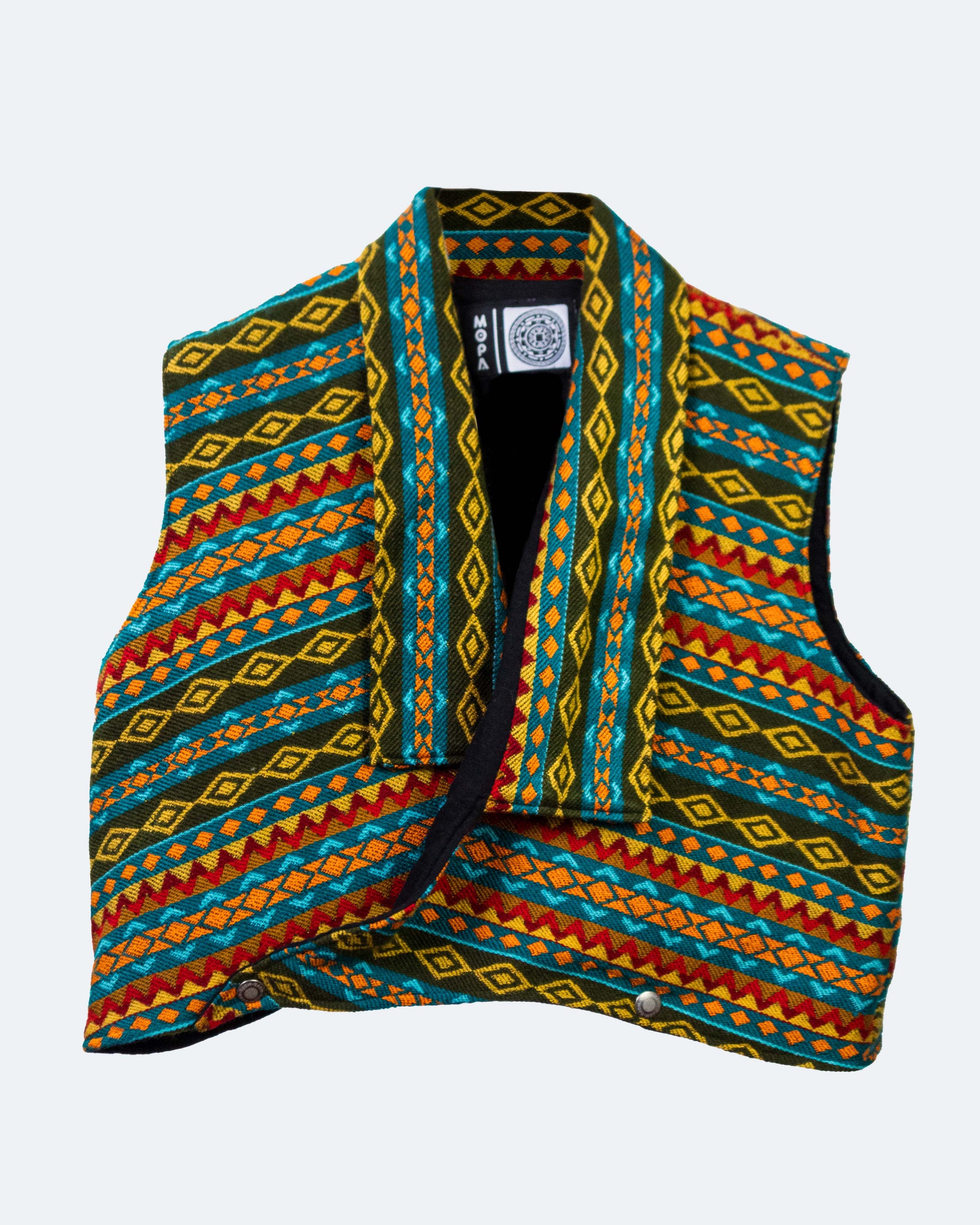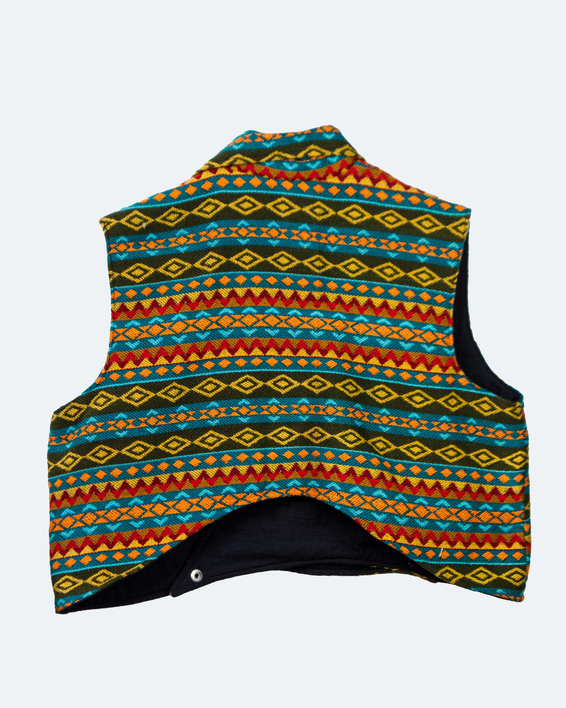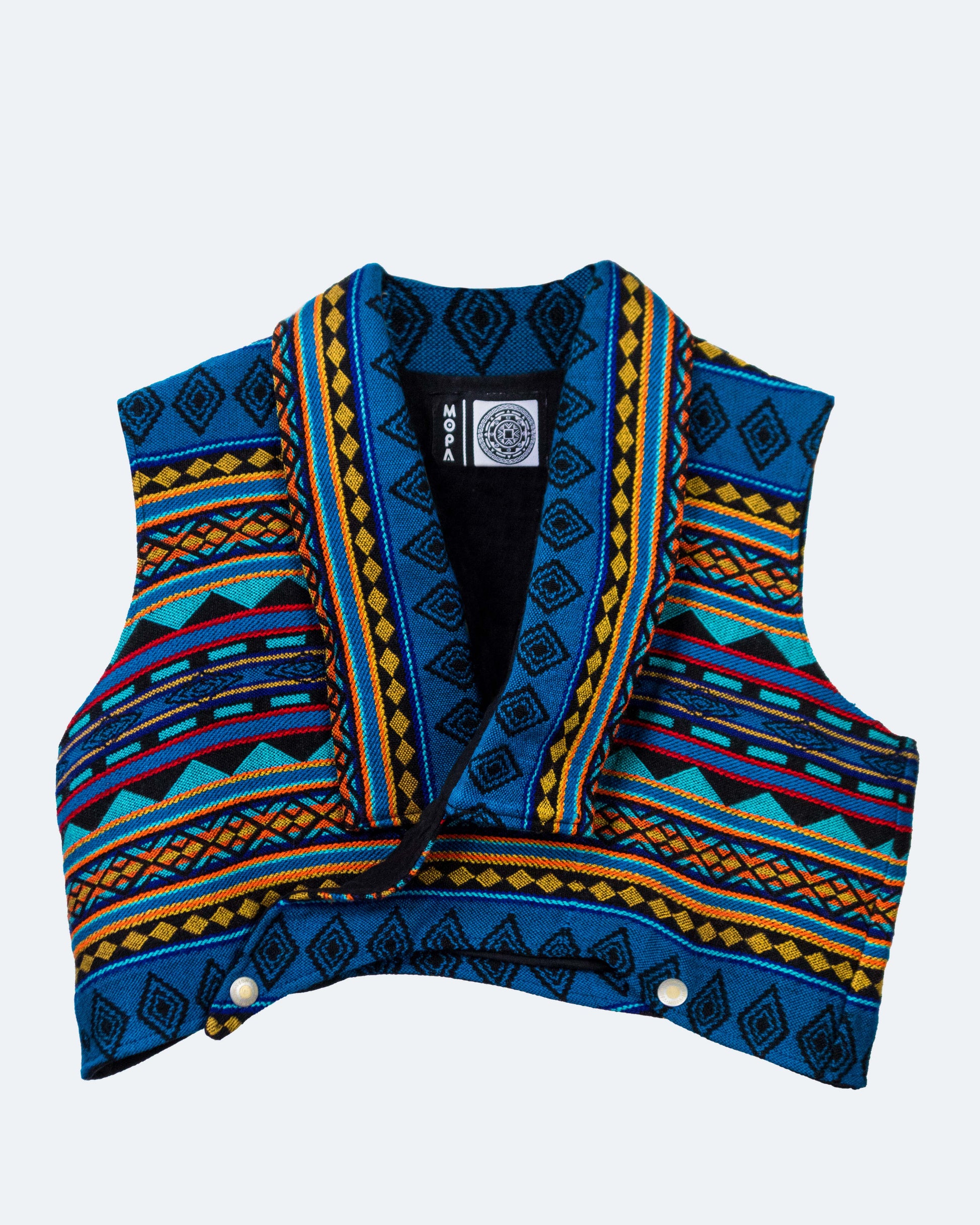 Este top de tejido andino combina la estructura del denim con la calidez de los tejidos artesanales, creando una pieza única, femenina y poderosa.